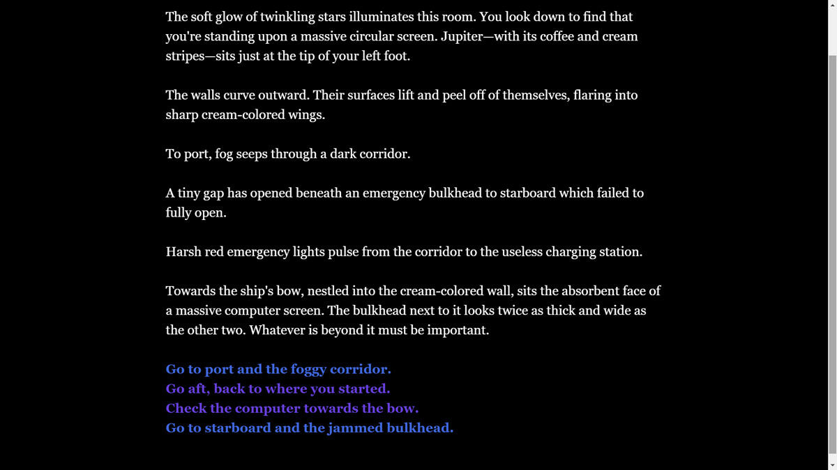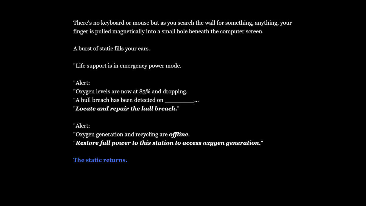 Low Oxygen is an interactive fiction game made in Twine. You play as a lost robot, navigating the halls of a failing starship. You'll see the ship through different perspectives as you rescue and play as your robot buddies (who all deserve pets for being good).I designed the story like a Metroidvania: some paths become accessible only once the player gains a new ability!