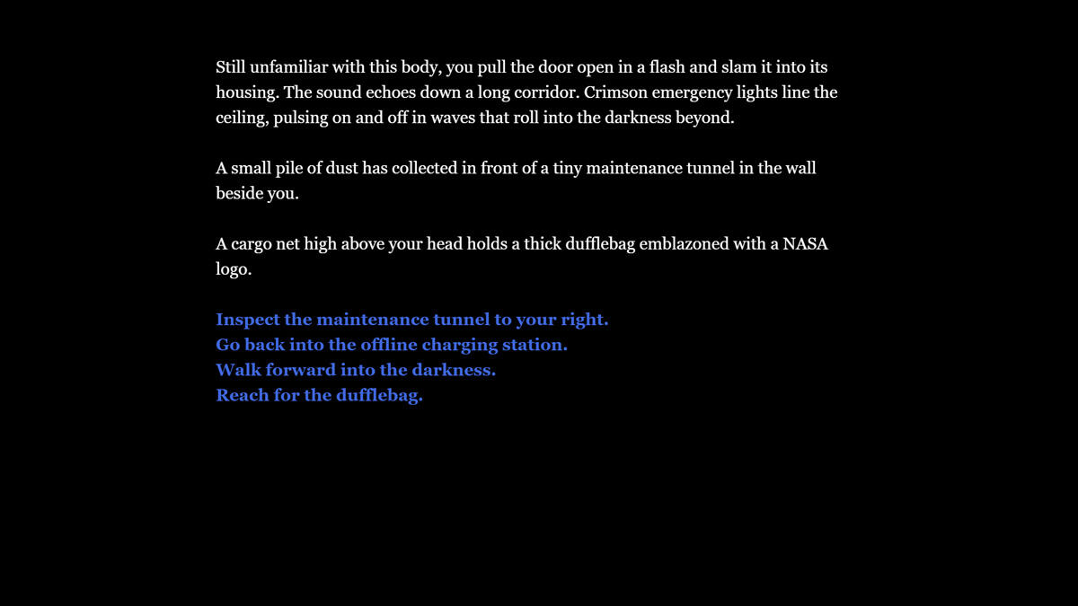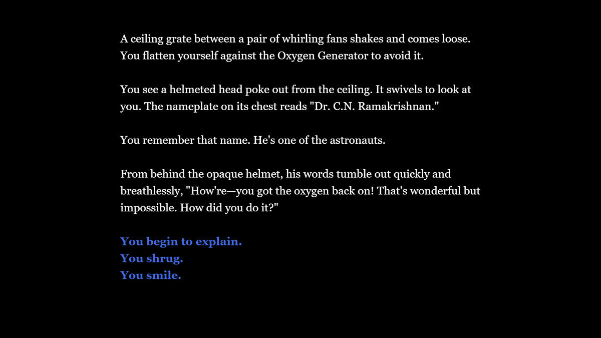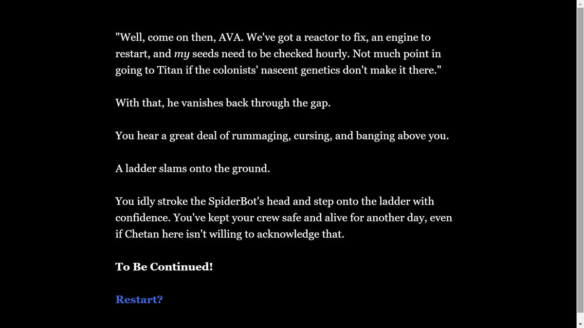 This game is also a short prequel to my novel Titanborn. Chetan is, in a word, a jerk. He does confirm what the gameplay has taught the player: they aren't just an amnesiac android, they're part of the ship's artificial intelligence, AVA!The final scene has the last of three moments where the player's android gives another robot a supportive pat. I love the idea of an AI that's empathetic towards its fellow bots.
