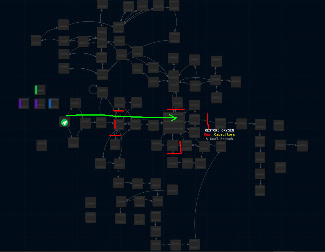 At the onset of the game, the player is driven ‘rightward’ along the screen line and towards the big square: the main hub. Other paths marked by red lines are interactable but blocked, for now.Like in a good Metroidvania, I wanted the player to recall spaces they've been through and come back later to surmount obstacles with new tools.