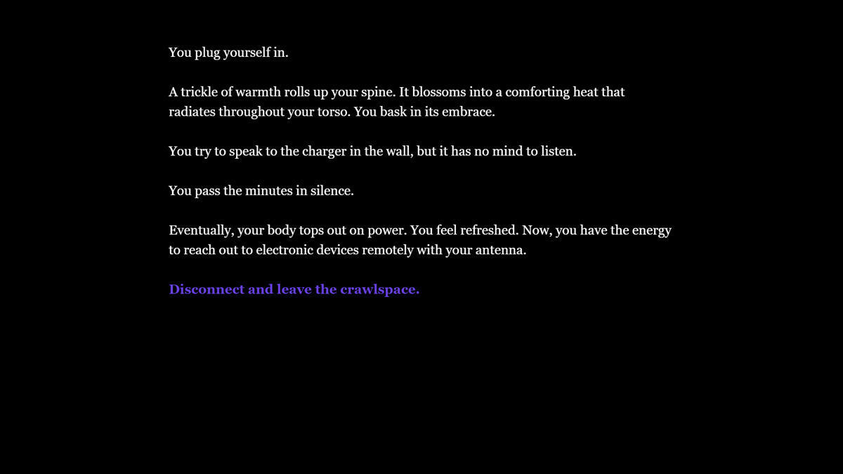 Through exploring foggy corridors, peeking beneath broken doors, and walking the empty halls of the powered-down ship, the player will find their first upgrade.Charging their body to 100%, the player gains new insight about themself and the ability to access the spiderbot remotely.