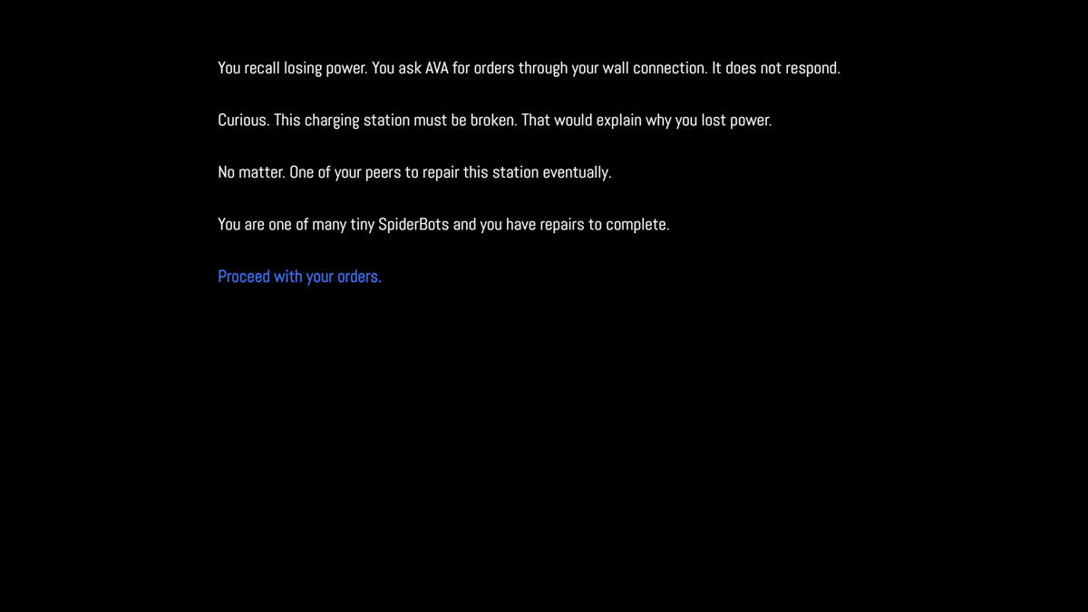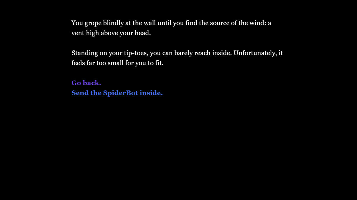 Unfortunately, there isn't room for two AI's in the bot's head. The spiderbot takes over, symbolized by a change in text font, and forces the player to backtrack.Through this action, the spiderbot reminds the player of an early obstacle and how they can surmount obstacles with new tools, like the spiderbot's body. To regain control, and survive, the player must solve a text input puzzle.